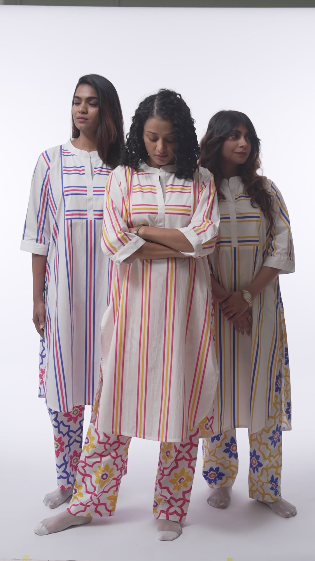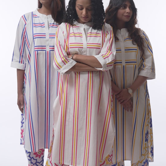Step into summer with this breezy, handcrafted kurta set, inspired by the vibrant geometry of Goan tiles, this white poplin kurta set features bold vertical and horizontal stripes in sun-washed hues of pink and yellow. The back and trouser is adorned with mosaic tiles echoing the artisanal charm of coastal mosaics.