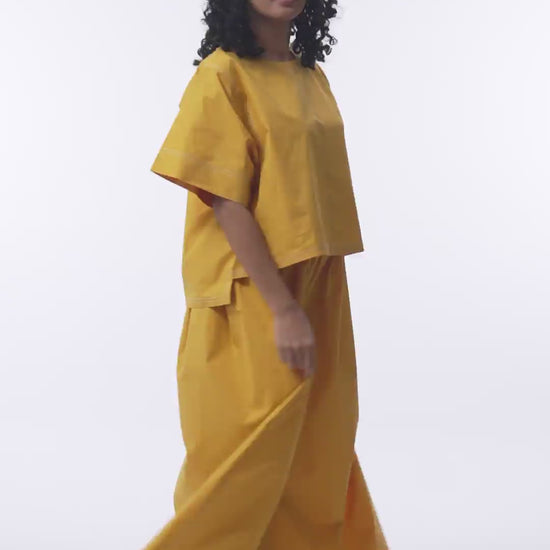 This bright Ameralo top is a study in clean lines and confident construction. Crafted from a breathable cotton, it features crisp white contrast stitching that traces its architectural seams. The boxy fit and structured shoulders lend it a modern edge, while the minimal neckline keeps it versatile. Paired with antifit relaxed pants for a bold yet balanced look