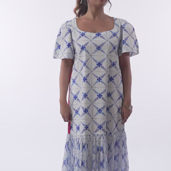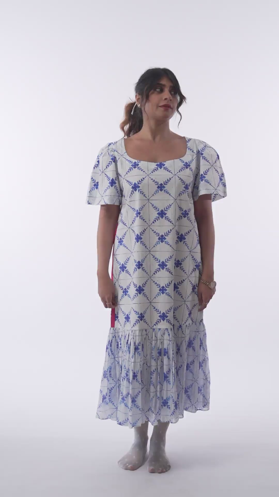 A breezy straight-fit dress crafted in a soft, breathable poplin dress, featuring an all-over blue tile print on a subtle white base. Designed with a round neckline, short sleeves, and a gently gathered tier at the hem in soft mul. Finished with contrast side panels that add a modern pop of colour, this effortless silhouette is perfect for everyday summer wear and relaxed outings.