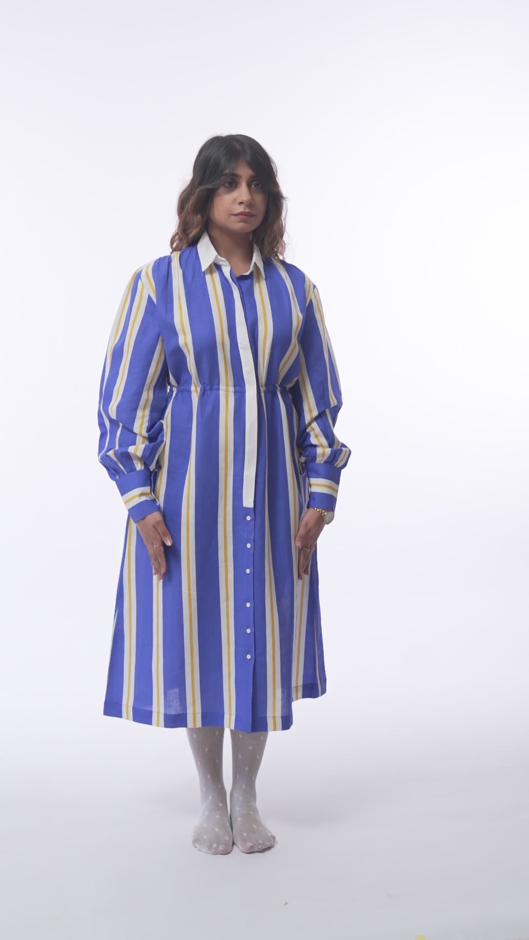 This relaxed shirt dress is designed for effortless everyday elegance. Crafted in a lightweight, breathable Cotton linen fabric, it features bold vertical stripes in vibrant blue, crisp white, and warm yellow that create a clean, elongating look. The classic collared neckline with a front button-down placket adds a tailored touch, while the full-length sleeves designed ,can be worn rolled up, offer versatile styling. A gathered waist enhances style with comfort without compromising on ease, making it perfect for warm-weather work days , travel, or casual wear.