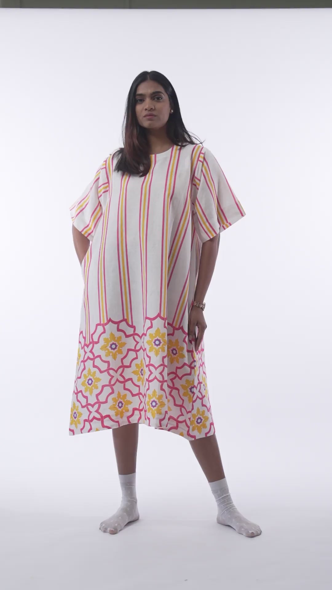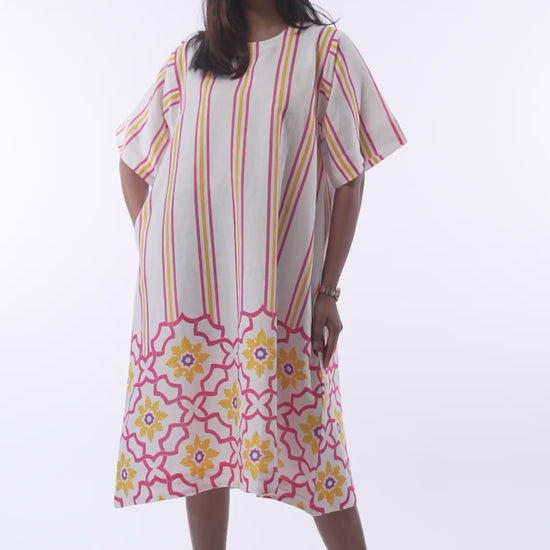 Fresh, feminine, and effortlessly comfortable, this straight-cut dress is designed for easy summer dressing. Set on a soft white base, it features cheerful vertical stripes in pink and yellow that lend a flattering, lengthening effect. The hemline is highlighted with a vibrant mosaic-inspired border, adding a playful yet artisanal touch. Crafted in lightweight, breathable cotton linen fabric, the dress comes with a clean round neckline and short sleeves for all-day comfort.